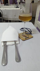 Ceno al Cafè Estrela. Tonno, vegetales, riso. Cerveja mini e copo do vinho