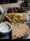 Ormai è ora di cena e mi aggrego anch'io alla gente seduta in qualche taverna. Sono in un bel posticino, con un tavolino fuori e tutto in pendenza, che rischio di volare giù. Si chiama psitopoleio O Stamatis. Buoni gli spiedini di carne e da quanto vedo il posto è molto popolare sia per i locali che per gli stranieri.