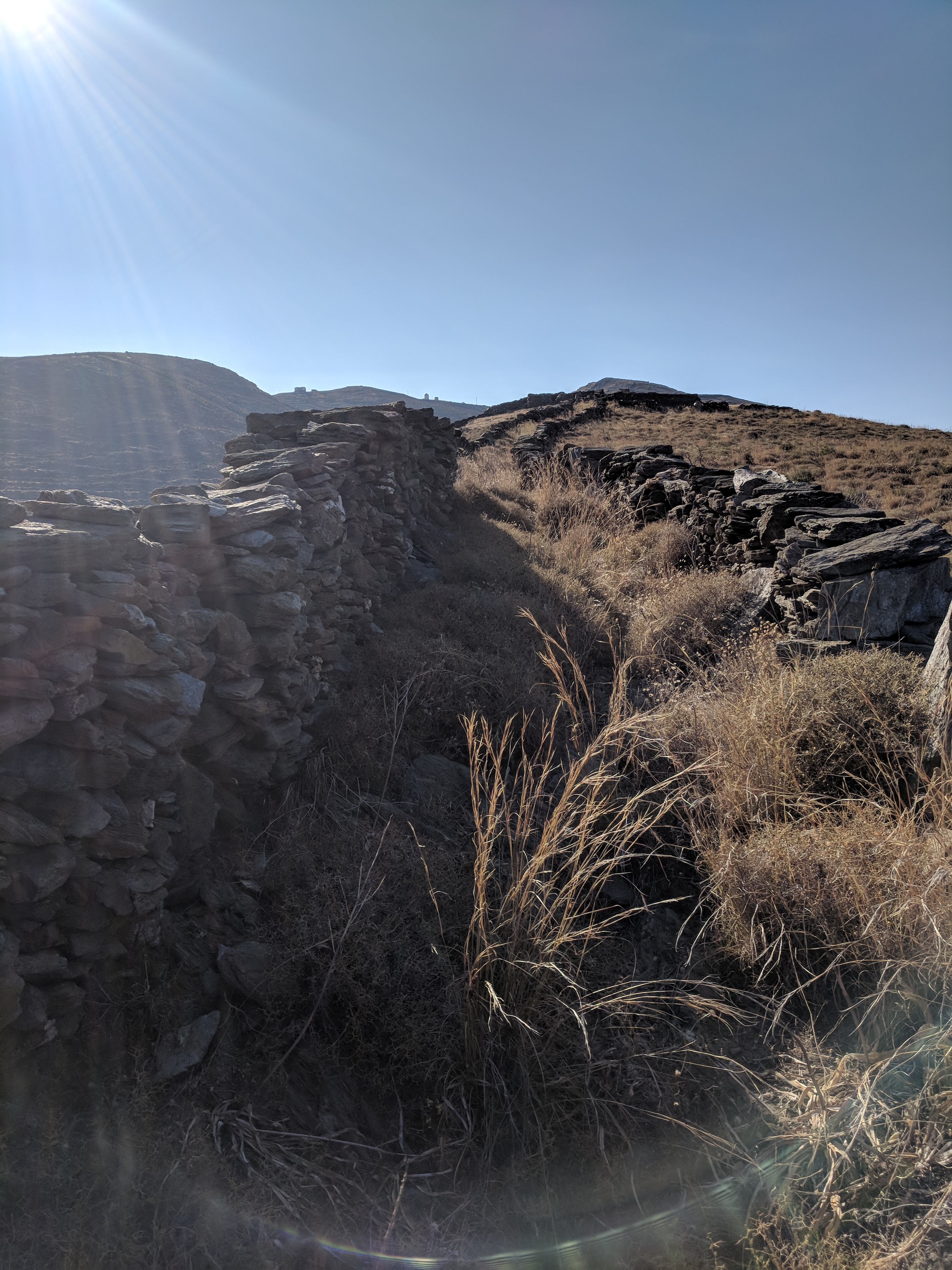 All'inizio seguo la strada fino alla spiaggia di Episkopi, poi risalgo e cerco il sentiero numero 6 nel tratto che taglia verso Xora e che passa vicino alle chiese di Xristos e Ay Nikolaos. Il sentiero è chiaro e ben visibile stretto dentro muretti a secco ma con il gps mi sento sempre più sicuro.