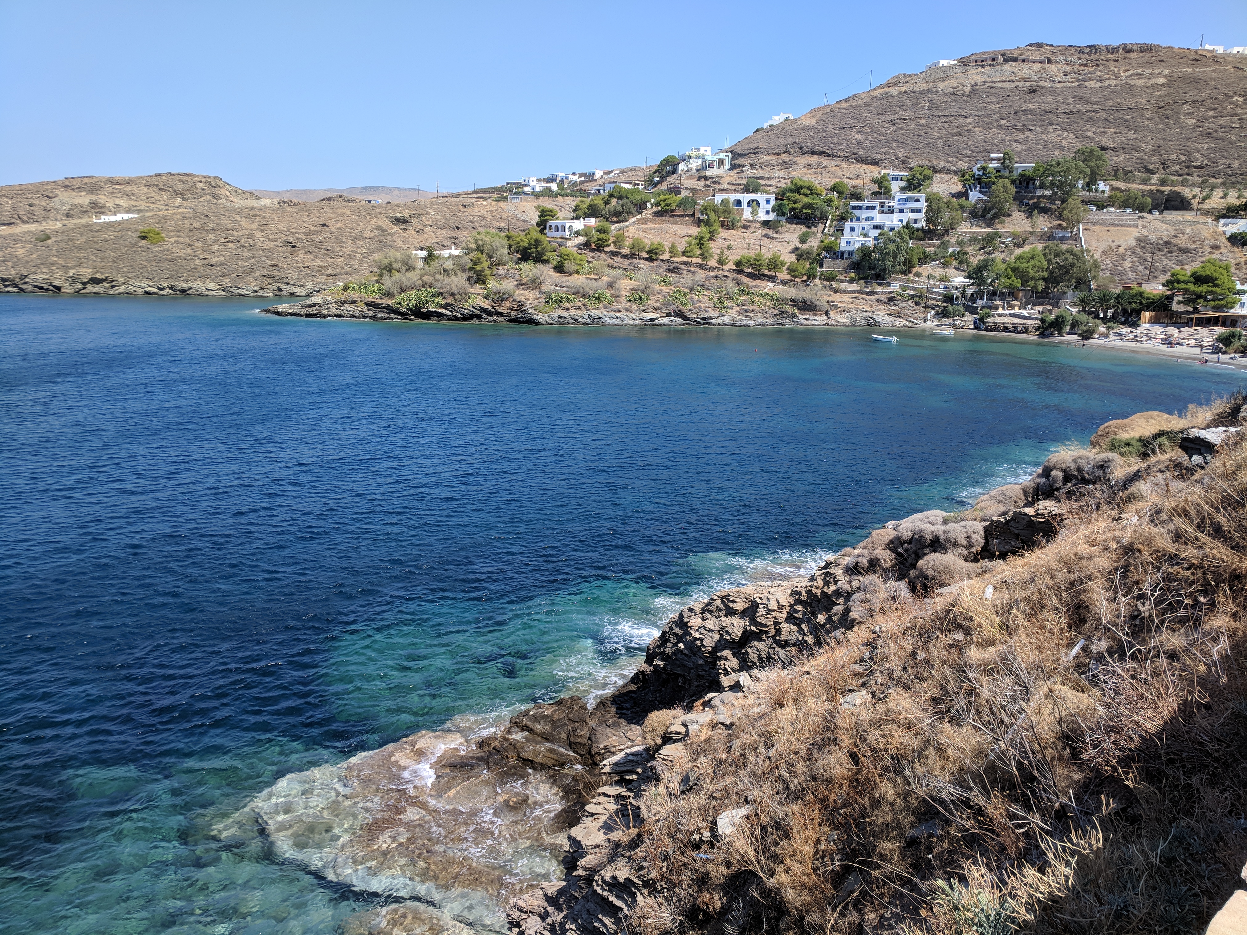 Seguo la cartina di Kythnos e mi attrae l'idea di andare alla spiaggetta di Andonedes. C'è gente ma è una bellezza, acqua super trasparente. Ci si arriva da una scalinata ripida dietro al gruppetto di case sull'estremità del promontorio, dietro un paio di chiese.