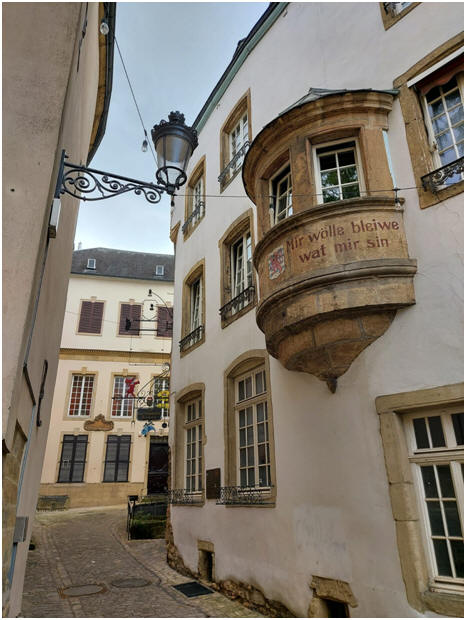Ennert de Steiler (2 Rue de la Loge). A parte il piccolo terrazzino al primo piano, ci è piaciuto mangiare all’aperto sotto questo bell’edificio. Quello che abbiamo preso era molto buono e abbondante (toast e insalata di pollo). Qui accanto c’è il bovindo con “Mir wëlle bleiwe wat mir sinn”