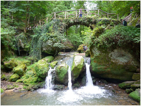 Cascata di Schiessentumpel. Unitamente al ponte che la sormonta, è una delle immagini più note del Lussemburgo. Si raggiunge agevolmente in auto (ma il parcheggio è piccolo) o con il bus e poi con pochi minuti a piedi lungo un sentiero molto facile. Il ponte in pietra arenaria è stato costruito nel 1879 in soli quattro mesi e, sebbene non abbia alcuna funzione pratica in termini di mobilità in Lussemburgo, è stato il simbolo della regione di Mullerthal. Posto rilassante per il fresco, la folta vegetazione e il rumore della piccola cascata.