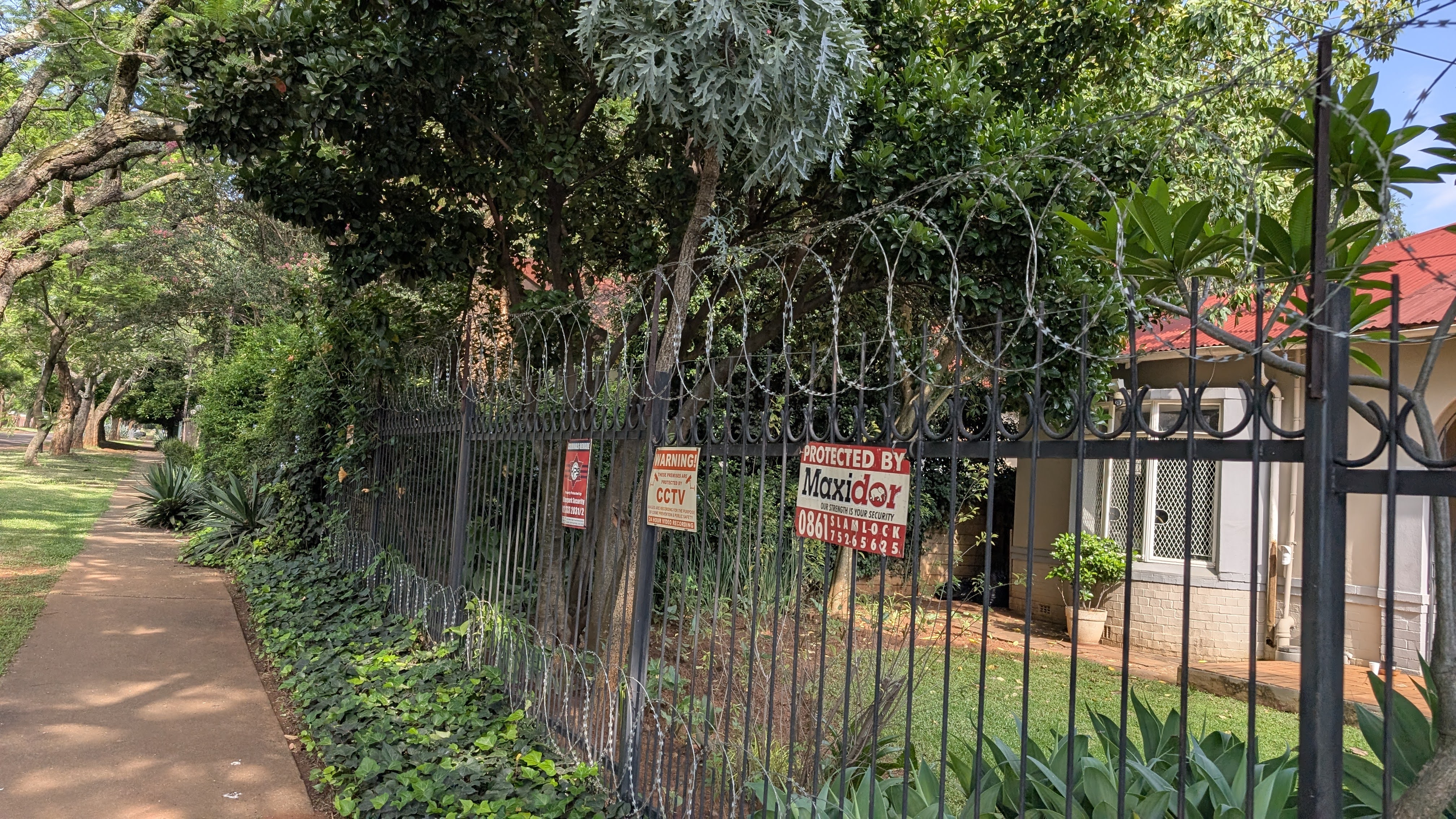 In 35 anni di viaggi, negli ultimi anni anche da solo, non avevo mai avvertito una pericolosità così. Filo spinato aggrovigliato a difesa dei muri di recinzione delle case, tensione elettrica su recinzioni che bordano edifici e cartelli della security (armed response) che difendono le proprietà. Ovunque, da nord a sud.