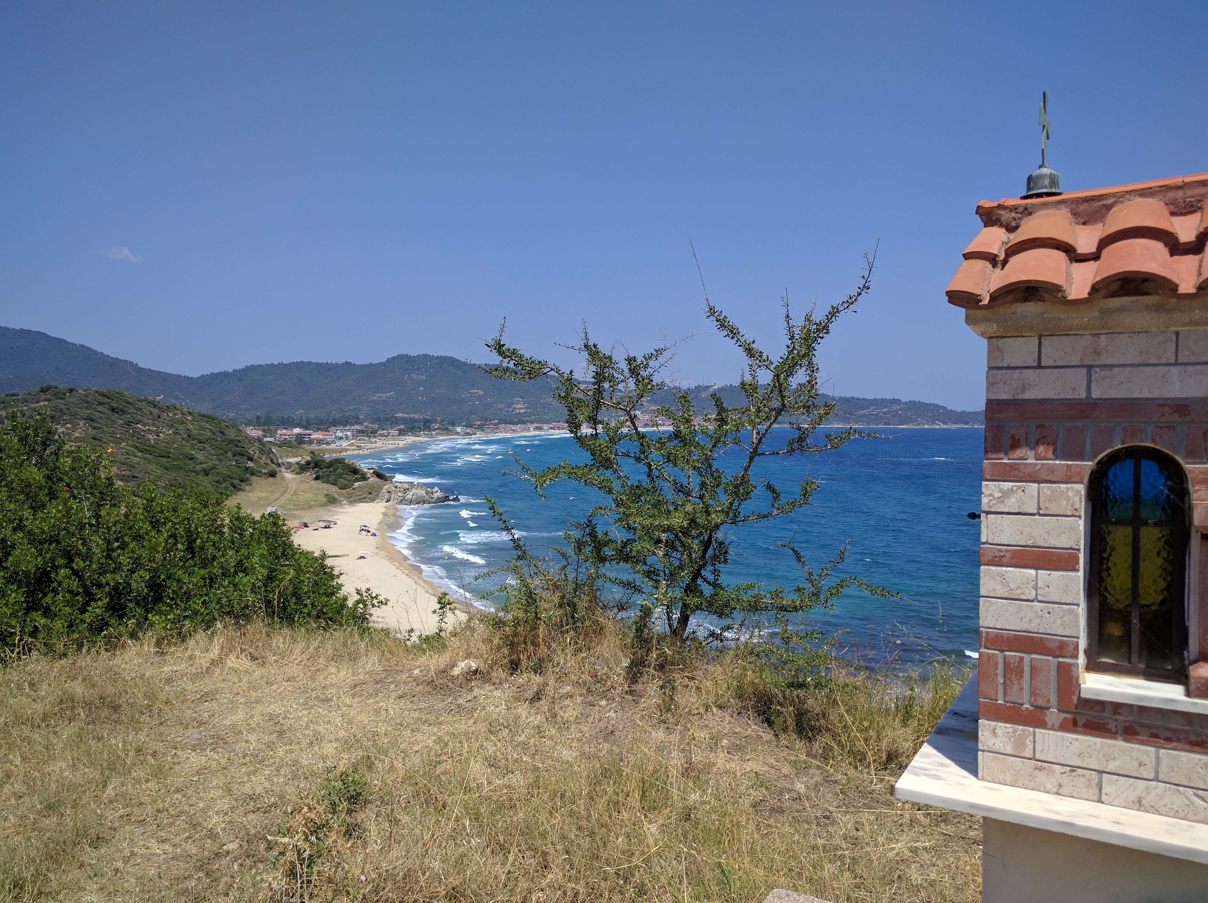 Lungo la strada che in questa parte è alta e viene nascosta la visuale sulla costa, ci sono deviazioni per alcune spiagge tra le più belle della penisola Calcidica.