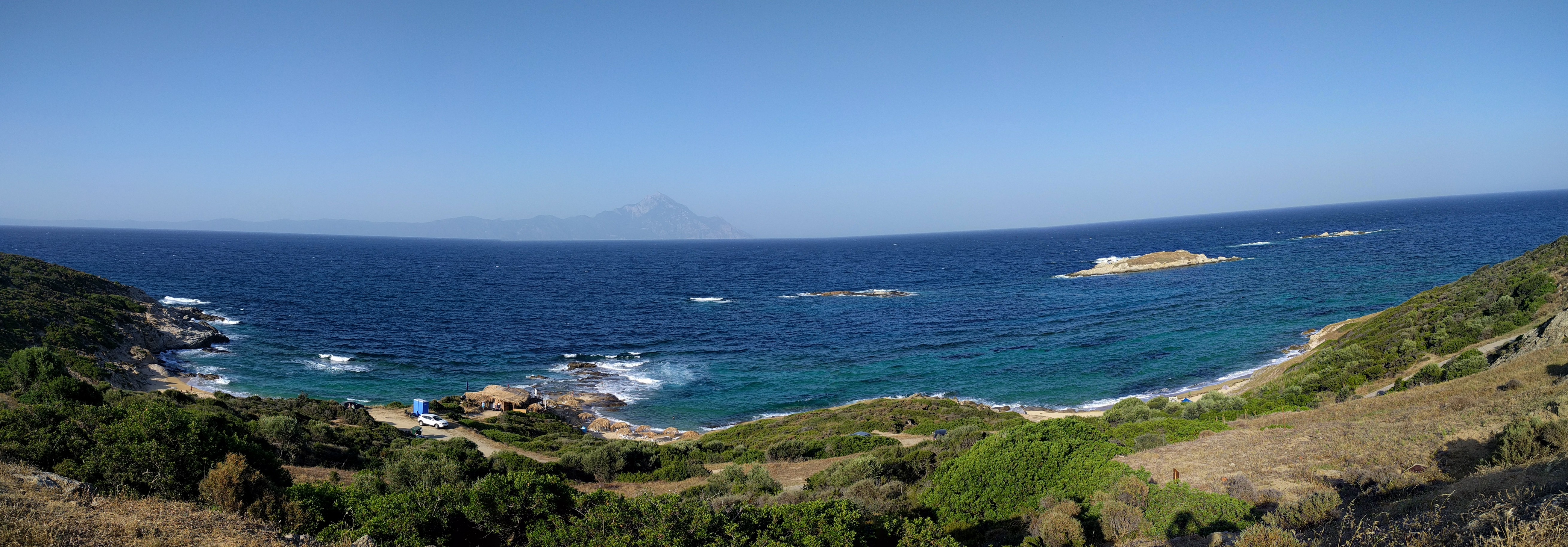 Il mare è una meraviglia. Acqua turchese e celeste oppure verde acqua marina. E in fondo il blu che più lontano si scurisce increspato e sullo sfondo il monte Athos.