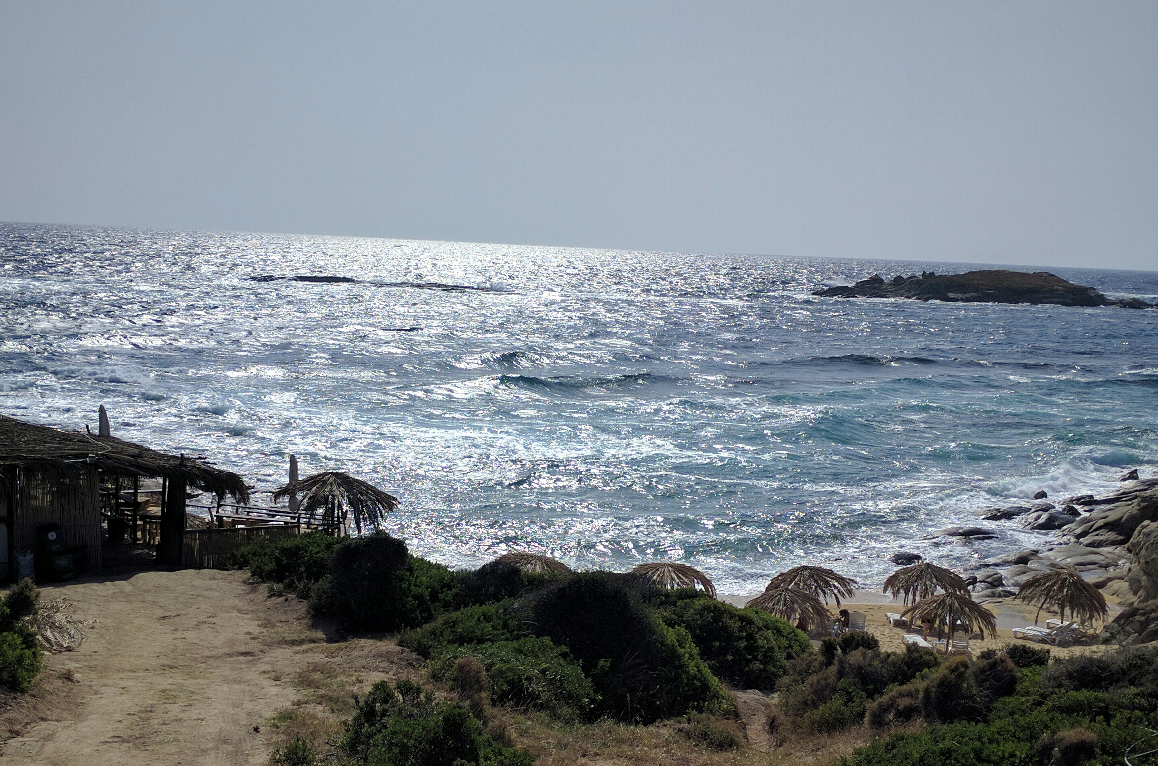 Lasciamo Skala Maries dopo colazione. La spiaggia di Atspas è già un po' affollata sotto gli ombrelloni di paglia. Decidiamo di proseguire oltre. Questo tratto di costa è meno caratteristico di quello orientale e meridionale dell'isola anche se il colore dell'acqua con le sue sfumature di verde è ammaliante.