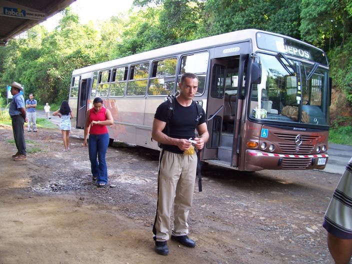 C’è fango dappertutto e tutti, compreso il bananero, ci rifuggiamo sotto una pensilina di legno posticcia aspettando il bus per Cariari. Sotto la pensilina facciamo amicizia con Ellliot, un campesinos della zona, con il quale scambiamo quattro chiacchiere. Finalmente alle 13 passa il bus che si ferma per mezzora prima di ripartire e dove continuiamo piacevolmente a parlare con Elliot. Ha un negozio non si capisce bene di cosa e possiede una “finca” proprio sul rio suerte, vicino alla fermata del bus. Parliamo delle piante di banane che ci circondano in distese interminabili di piantagioni intensive. Ho capito che le piante di banane diventano adulte dopo 9 anni e maturano in tre mesi. Poi si finisce a parlare di droga che entra nel paese proveniente dalla Colombia da dove viene trasportata con imbarcazioni velocissime sulla costa e da li in tutto il paese. Il controllo americano è continuo e spesso i gringo sparano sui contrabbandieri in virtù di accordi bilaterali per la lotta al narcotraffico e delle due basi dei marines sia in Costarica che a Panama. Elliot racconta che le banane vengono prodotte maggiormente in Costarica (cichita, dolè…) e che vengono colte ancora verdi e stivate in container per l’Europa e dove maturano lungo il viaggio a causa del caldo delle stive. Intanto tra una buca e l’altra arriviamo a Cariari dove facciamo subito il biglietto per San Jose. Partiremo alle 15.00 per arrivare alle 17.00 circa nella capitale. Siamo bagnati, stanchi, i sedili sono stretti e con Fabio ci dividiamo per stare più larghi. Continua a piovere e alla radio trasmettono una canzone in spagnolo di Ramazzotti. Ho sonno e chiudo il mio diario di viaggio. Arriviamo al Terminal Caribe in orario e mentre Fabio va in bagno io cerco un tassista e concordo un passaggio per il Terminal Coca Cola a 800 colon. Sugli schermi danno la partita di calcio del Deportivo Saprissa. Vedo Fabio e montiamo sul taxi. Arrivati al Coca Cola ci accorgiamo che per il bus per Quepos c’è ancora tempo e ne approfittiamo per scrivere a casa da un un’internet caffè e scaricare le centinaia di foto fatte nell’hard disk da viaggio. In questo terminal si aggirano le persone più colorate. C’è un pazzo che interpreta una storia urlando, credendo forse di essere un attore. Un vecchietto che chiede l’elemosina. Un lustrascarpe che lucida los zapatos al nostro autista. Un transessuale che corre appresso al suo cane che scappa. Una guardia mi passa accanto e indicando il bagaglio mi dice: “Quidado a la mochila”. Urla, Clacson ed un brusio che ci accompagna alla partenza. Alle 19.30 partiamo per Quepos, anche qui ognuno ad occupare tre posti. Io dormo mentre Fabio chiacchiera con una che nel frattempo gli si è seduta accanto. Ad un certo punto del viaggio, leggendo la guida mi accorgo che il lunedì il parco di Manuel Antonio è chiuso… cavolo!! Dobbiamo cercare qualcos’altro da fare per domani!!