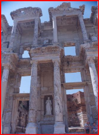 Oggi è l’ultimo spostamento in macchina che abbiamo in programma: da Pamukkale a Kusadasi, via Denizli, con sosta lungo il percorso per visitare Efeso. Durante la notte sia Paola che Barbara sono state colpite dalla “maledizione del sultano”, ma le pastiglie di Imodium mettono entrambe in buone condizioni nel giro di un’oretta. Accompagnamo la proprietaria dell’albergo a Denizli, dove va a trovare il fratello malato in ospedale. Alla stazione degli autobus di Denizli carichiamo in macchina altri due suoi parenti, siamo in 7! Degni di una macchina turca! Percorriamo così poco più di un chilometro verso l’ospedale… all’arrivo non finiscono più di ringraziarci. Il viaggio procede anonimo per circa 150 km, fino ad Efeso… finalmente vedrò il sito archeologico che ho sempre visto sui libri. Parcheggiata l’auto, entriamo percorrendo una via lastricata, non prima di aver pagato i soliti 15 milioni alla cassa; passiamo un enorme anfiteatro, anche se in condizioni meno buone rispetto a quello di Hierapolis. Da qui imbocchiamo la via sacra, una strada lastricata di marmo, fiancheggiata da colonne a destra e a sinistra, come se fossero alberi. Arriviamo così a vedere la biblioteca di Celso, una meraviglia che da sola vale la visita: colonne intarsiate, iscrizioni in greco e romano( anche in tedesco per la verità!?) e statue ad ogni piano. Ci fermiamo estasiati per quasi un’ora ad osservarla in ogni suo punto e a fare le foto ovviamente. Ritorniamo sulla via sacra e continuiamo la visita ai templi, ai bagni pubblici dell’epoca e al bordello. Riprendiamo la stessa strada per il ritorno quando sono le due del pomeriggio; arrivati alla macchina puntiamo per Kusadasi, una bella cittadina sul Mar Egeo, anche se molto turistica. Esiste perfino una copia del Gran Bazar di Istanbul con negozi pronti a venderti tappeti, oro, maglie, libri o quant’altro. Mangiamo in un ristorante sul mare e poi troviamo un albergo. Kusadasi è anche l’ultima tappa per la nostra auto, la restituiamo infatti all’agenzia Avis locale. Il resto della giornata è dedicata a doccia e riordino degli zaini, acquisto di ricordi e regalini vari e per concludere il solito te(çai) con il proprietario dell’albergo, che ci intrattiene chiacchierando di moltissimi argomenti, fra cui l’immancabile calcio e Mister Terim. La serata la trascorriamo mangiando pida in un ristorantino del centro e passeggiando lungo il mare.