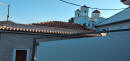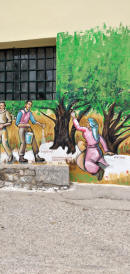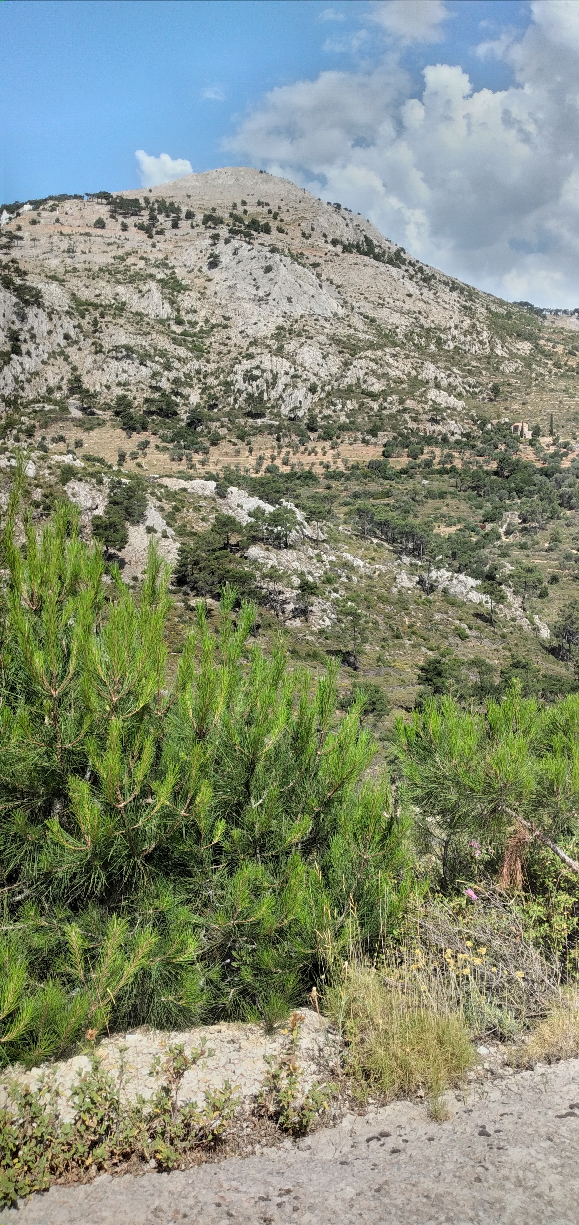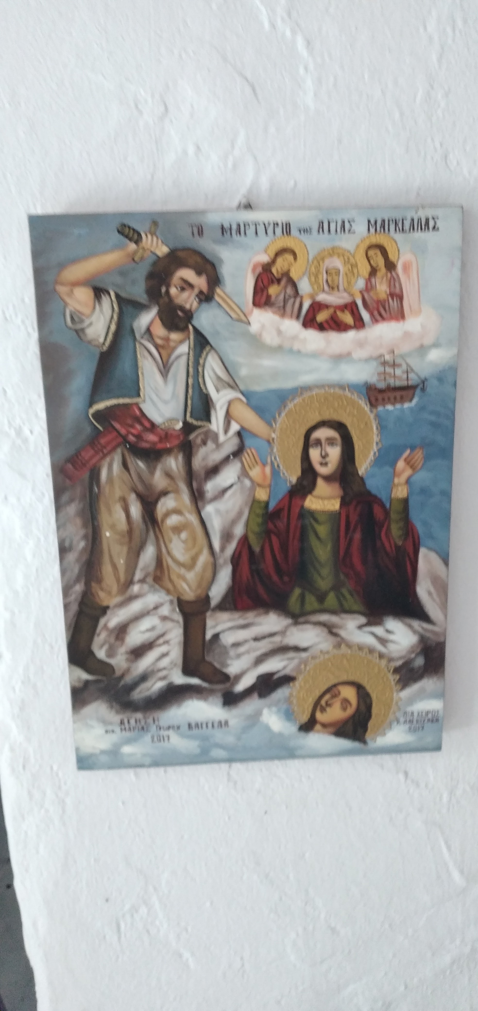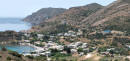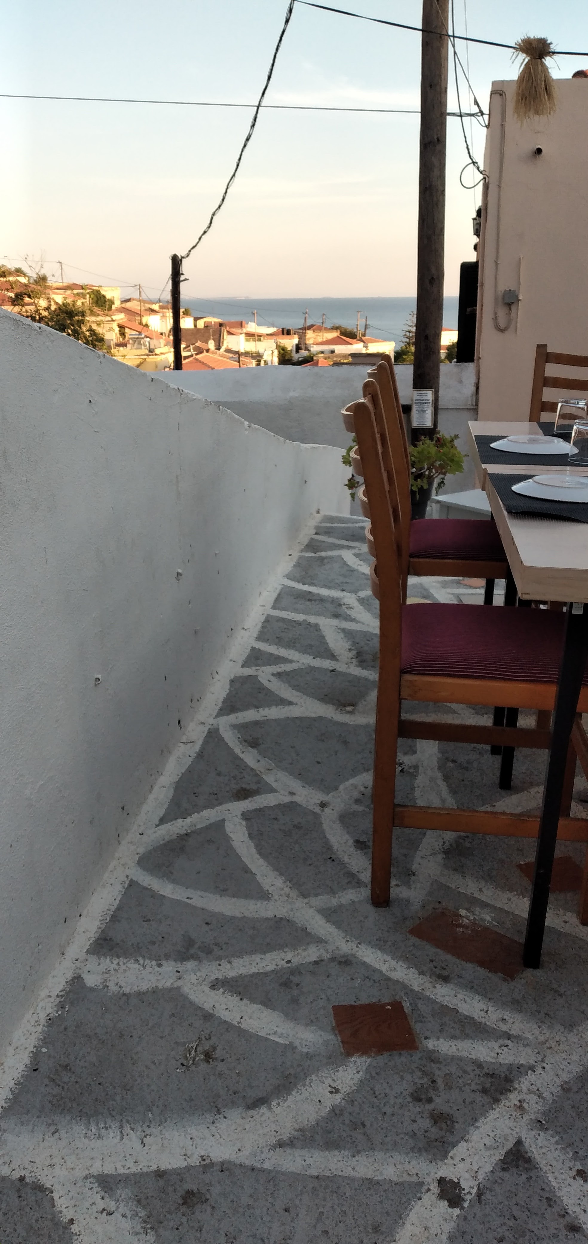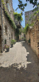 una funzione appena svolta. Lastrada corre per lunghi tratti sul mare e permette di vedere belle insenature come Glaroi beach, ma oggi non ci dedichiamo ai bagni. Ci fermiamo a Lagada per un frappè nescafé ad uno dei tanti bar del porticciolo. Un gruppetto di anziani greci se la raccontano…Prima di kardamili deviamo verso Pythius e dopo pochi km troviamo l'inizio di uno dei tanti trail che ci sono in Chios. È già mezzogiorno, ma decidiamo di salire al Gria castle .Una stradina rossa ben segnalata in 40 mm porta in cima dove si vede ancora molto ben conservata la torre e le mura della fortezza. Fa già caldo quando riguadagniamo la nostra Picanto e continuiamo sulla strada per Pityusa stanco paesino all’interno di monti e campi coltivati per lo più a vigna. Una bella torre svetta a testimonianza del periodo genovese . Con un po’ di fatica e l’aiuto di google map riusciamo ad arrivare al paesino di Dexia dove ho appuntamento con Caterina della taverna Peukos contattata via viber +0306971567207 . E’ lei che custodisce le chiavi del monastero di Ιερά Μονή Μουνδών meno famoso di quello di nea Moni e di altri, ha il fascino di non essere meta di orde di turisti . L ‘ultimo monaco è stato qui fino al 1961, poi il decadimento…Una volta all’anno alla festa di san giovanni battista il 29 agosto immagino si riempia di fedeli visto che all’esterno sono stati costruite impalcature e toilette.All'interno è completamente affrescato! Bellissimi e integre pitture sulle pareti e sulla volta …quasi il tempo non fosse trascorso. Accendiamo una candela in segno di devozione come ci dice Katerina e lasciamo una mancia per questo. Non ci è richiesto nient’altro. La loro taverna è a pochi km dal monastero e ci fermiamo a pranzare. Sui 4 tavoli direttamente sull ‘unica strada del paesino , solo noi e due altri avventori del posto. Sono già più delle 15 quando riprendiamo la strada per Avonigma ( seguendo le indicazioni stradali che ci ha dato uno dei nostri vicini dai tavolo). Visitiamo velocemente la cittadina facendo il giro tra le case di pietra accuratamente restaurate per poi arrivare ad Anavatos . Saliamo alla rupe da dove le donne di chios si sono buttate nel 1822.per non cadere in mano turca, ma è tutto in ricostruzione da molti anni . Il paese ci appare deserto…nessuna casa aperta, solo un malinconico bar La strada che ci deve portare a karinta bay in pieno Mastichoria, corre tra le montagne della zona sud di Chios, poco verdi e con tantissimi tornanti, e bellissime vedute sulle spiagge della zona a sud di Volissos. Raggiungiamo Pirgy dove ci fermiamo a fare la spesa al supermercato proton, credo l’unico della zona. Altri 6 km di curve e raggiungiamo il karinta bay resort https://www.karintabay.com/ dove dovremmo fermarci per 10 giorni ..La spiaggia, che avrebbe dovuto essere attrezzata con lettini ed ombrelloni e bar, sarà pronta solo fra 10 giorni !! Decideremo il da farsi, intanto oggi la Picanto ci ha fatto fare 230 km attraversando l’isola in quello che è stato non solo uno spostamento dal porto, ma anche un buon assaggio di quanto Chios offre a chi viene non da turista frettoloso solo per fare bagni ed enumerare spiagge.