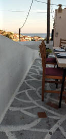 Oggi il programma prevede la scoperta delle spiagge a sud . Agia Dinami è la prima con acqua gelida e panorama mozzafiato dominata dalla chiesetta e con un bel parcheggio ombreggiato : ci piace molto. Salagona invece è invece una grossa delusione. La spiaggia non è ancora pronta , ma sarebbe comunque di grossi ciottoli. Ancora piantati dalla scorsa stagione ci sono file di ombrelloni di paglia con il cartello del numero e il costo : € 2. Troviamo invece aperto il chiosco alla spiaggia di Apothikos che è in alto alla fine dello sterrato che noi raggiungiamo a piedi. Da lì una scalinata ricavata nella roccia rossa porta alla spiaggia di ciottoli. Un buon nescafè frappè a quest’ora ci sta !!dopo un bel bagno decidiamo di andare a visitare Mesta . C’è molto caldo, ma all’interno delle strette stradine spira un bel venticello. Non pranziamo qui, nonostante le taverne nella piazza, perché abbiamo deciso di raggiungere il porto e proseguiamo per Mesta limani per gustarci un piatto di pesce. E’ un bel porticciolo con 2 taverne e acqua limpidissima . Dopo fava, calamaro e gavros , seguendo le indicazioni e una strada in parte sterrata raggiungiamo Didimi beach. Le spiagge qui sono due, ma la seconda è sporca all’inverosimile e con schiuma . Bello il panorama con l’isolotto davanti, ma si presenta male con una casupola in cui sono abbandonati oggetti di ogni tipo, dalla cucina al materasso, alle ciabatte, alle bottiglie vuote…peccato perchè ci sarebbe anche un po’ d’ombra dalle tamerici. Proseguiamo alla volta di Agia Irini ma non ci fermiamo vista l’acqua bassa e la difficoltà di entrare per i grossi sassi. Alla fine del molo c’è comunque una scaletta che permette di entrare in acqua senza farsi male, ma per oggi abbiamo nuotato abbastanza. Nella piccola baia c’è anche una taverna, forse in stagione affitta lettini…Non approfondiamo e riguadagnare la strada verso Vessa , altra città fortificata. parcheggiamo l’auto e girovaghiamo a piedi fino a raggiungere la chiesa che la domina dall’alto. Notiamo la grande diversità con Mesta. Qui pare tutto in malora…Molti sono i cartelli vendesi e le case sfasciate con porte distrutte che lasciano intravedere squallidi , umidi interni …