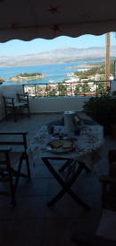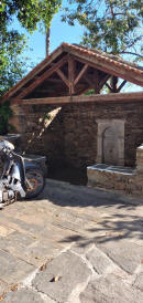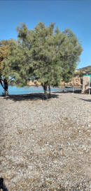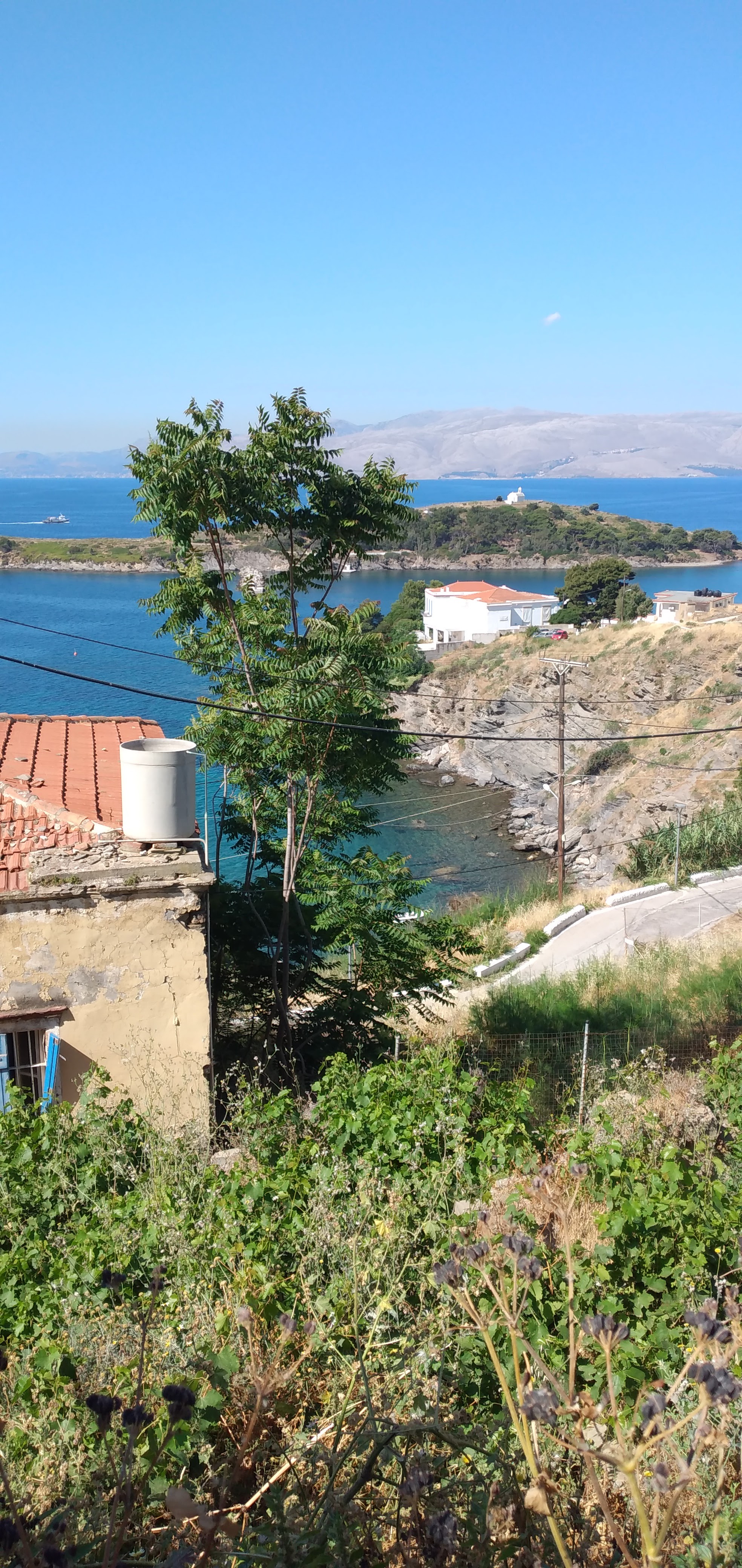 Usciamo di casa e teniamo la strada verso l’alto, percorrendola tutta raggiungiamo la spiaggia di Agios Yoannis dalle buone recensioni. Per noi una grande delusione visto lo scarico in mare delle acque depurate e le bolle in superficie in tutta la baia. La piccola chiesetta alle spalle della baia è chiusa e un cartello appena dopo vieterebbe di passare, ma noi percorriamo la stradina sterrata fino ad arrivare su una baia immersa nel verde di cipressi e con alle spalle un’antica fontana. Sicuramente nel verde della collina ci sarà una bella proprietà visto che nascosta da un telo intravediamo una barca e la zona è molto ben tenuta con panchine e accesso al mare. Ritorniamo al porto lungo la strada costiera e cerchiamo qualche baia per sostare, ma non c’è niente che meriti...Al porto vediamo che stanno costruendo un mega palazzo proprio dietro l'attracco del traghetto. Ci fermiamo al bar/ trattoria lungo il molo per un ottimo frappè e un panino. La difficoltà della lingua è tangibile. Solo greco, ma le due ragazze sono simpatiche e riusciamo ad intenderci. Proseguiamo verso bilal beach che è la più riparata visto che oggi si è alzato un po’ il vento e strada facendo decidiamo che ceneremo al bar/taverna che abbiamo appena lasciato nonostante il menù non sia eccelso. Al nostro rientro alle 19 ci allunghiamo fino all’estremità del golfo e vediamo la scuola e l'accademia navale che, come ci spiega un gruppo di ragazzi, ospita allievi da tutta la grecia. Il voto di ammissione non è molto alto, così ci dicono, e devono fare qui 4 anni dopo la scuola superiore, intervallati da mesi in mare durante i quali vengono però ben retribuiti !