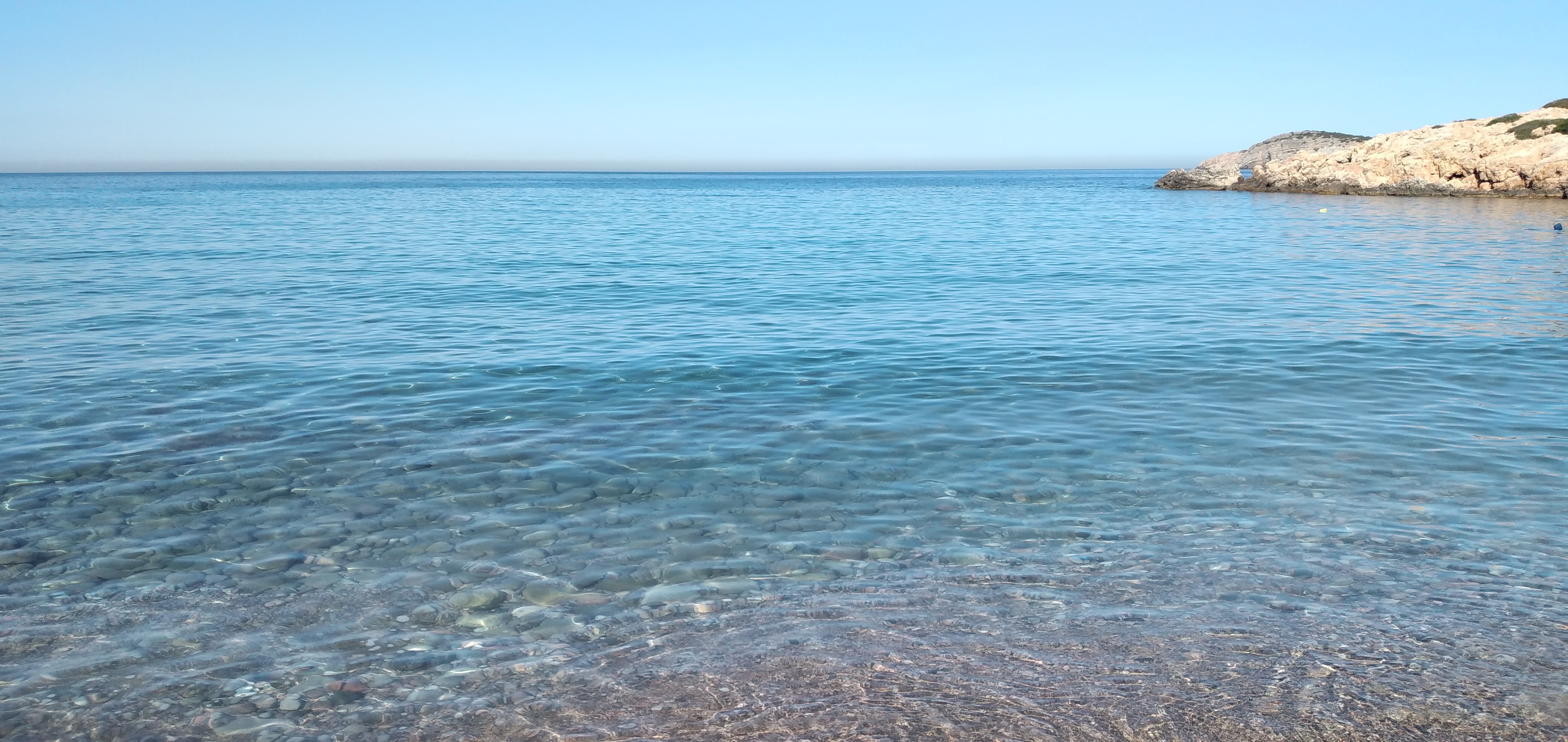 che siamo alla spiaggia di Mavri Volia. Non c’è ancora nessuno e percorrendo il sentiero lastricato e poi la scala, raggiungiamo la seconda e terza spiaggia di ciottoli neri. L’acqua è subito profonda e l’accesso non è facile, ma ci siamo portati le nostre fatidiche ciabattine per entrare con più facilità. Il sole scalda presto la spiaggia di ghiaia nera . Arrivando qui avevamo visto sulla strada il cartello che indica Vroulidia beach e così in un saliscendi infinito, tra alberi di lentisco, raggiungiamo questa bellissima baia ! Anche qui siamo soli a scendere la scala in pietra e ci guadagnamo la poca ombra disponibile. Risaliamo quando arriva gente e ci prendiamo un nescafè e un panino al baretto che ha appena aperto. E’ già più della una quando lasciamo l’auto nell’assolato parcheggio di Pirgy. Quattro passi per la città dipinta e un giro al Proton ( unico market della zona ) per un po’ di provviste. Sulla strada verso Karinta Bay tentiamo di raggiungere la spiaggia di Kato Fano. E’ però tardi e fa davvero troppo caldo. ! Passiamo il pomeriggio in casa e solo alle 18 riusciamo a scendere a piedi per un bagno in mare nella baia che dista da casa solo 10 minuti.