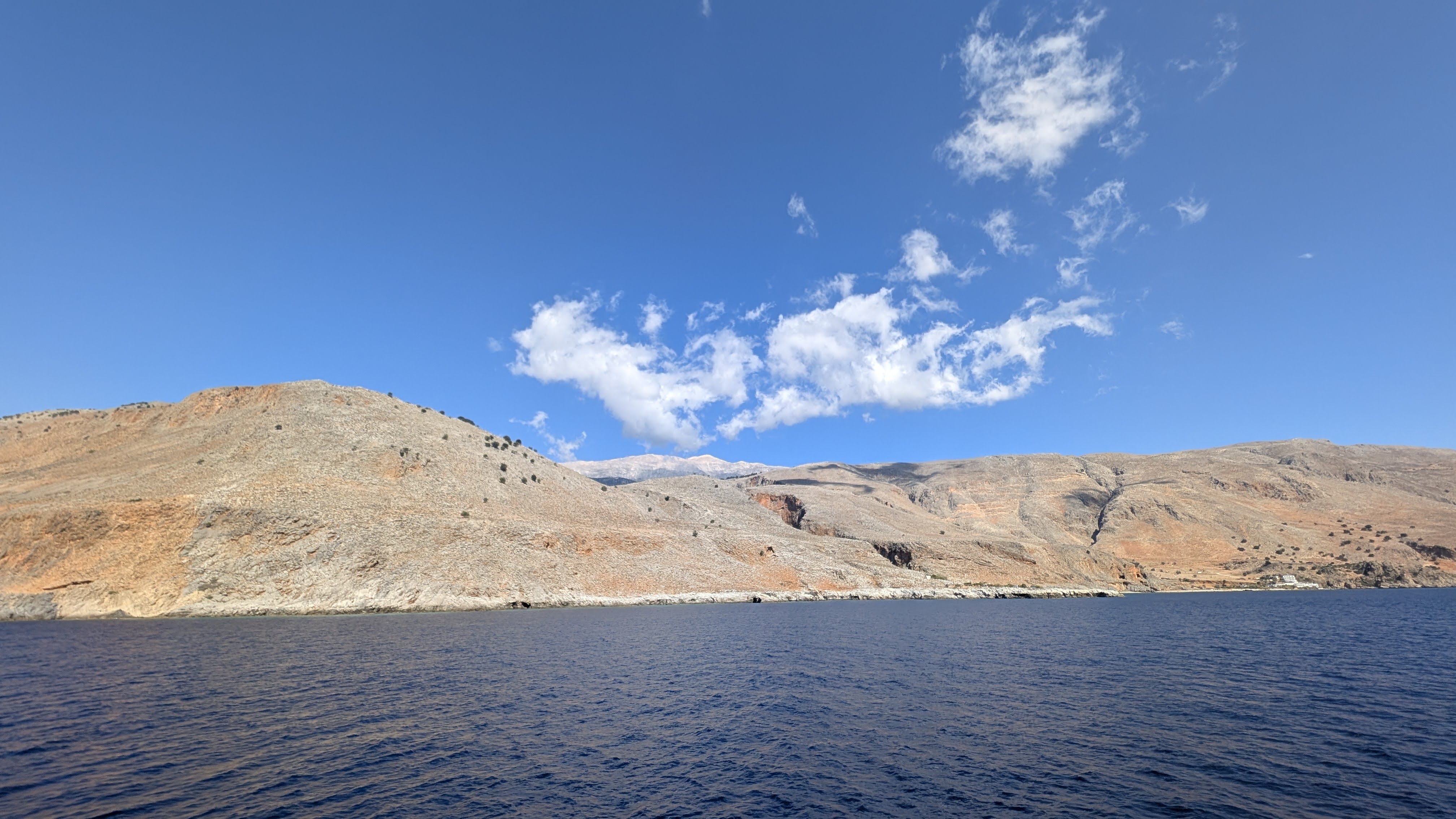 Passo il pomeriggio in spiaggia ammirando la costa sud di Creta che da qua si vede bene montagnosa.