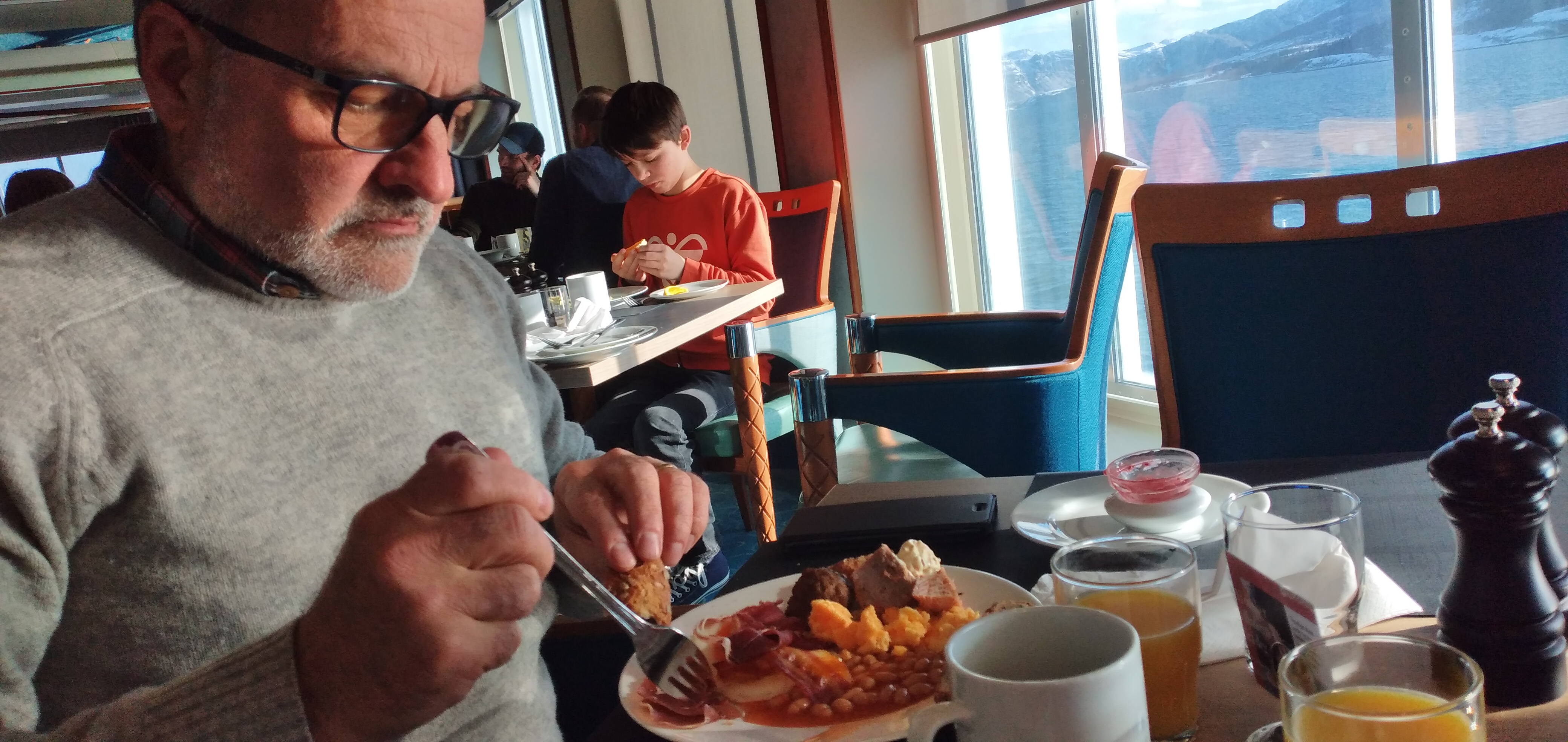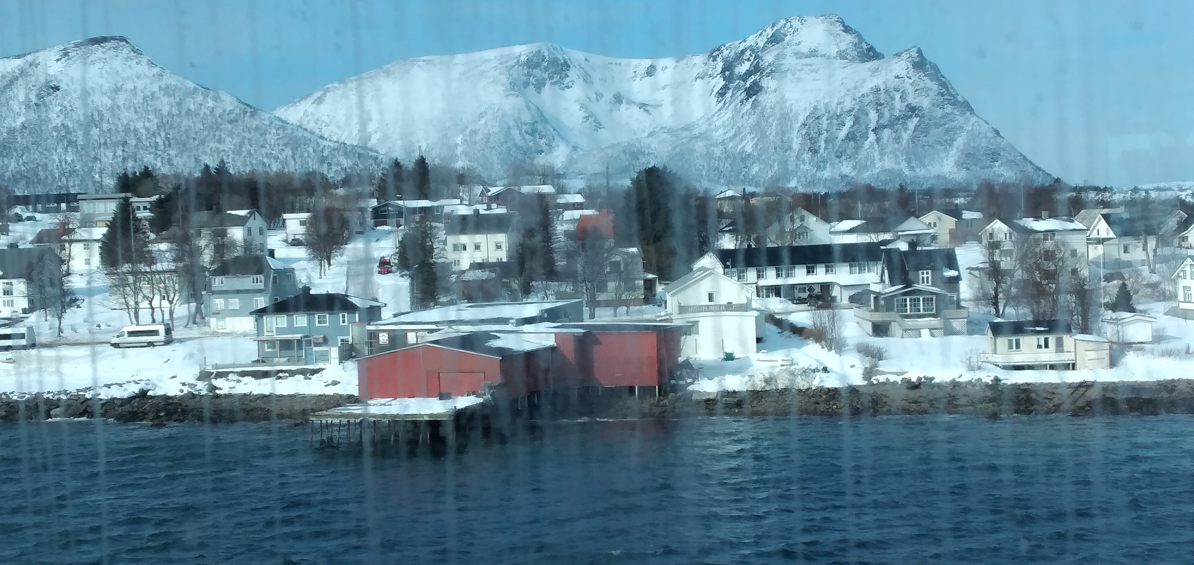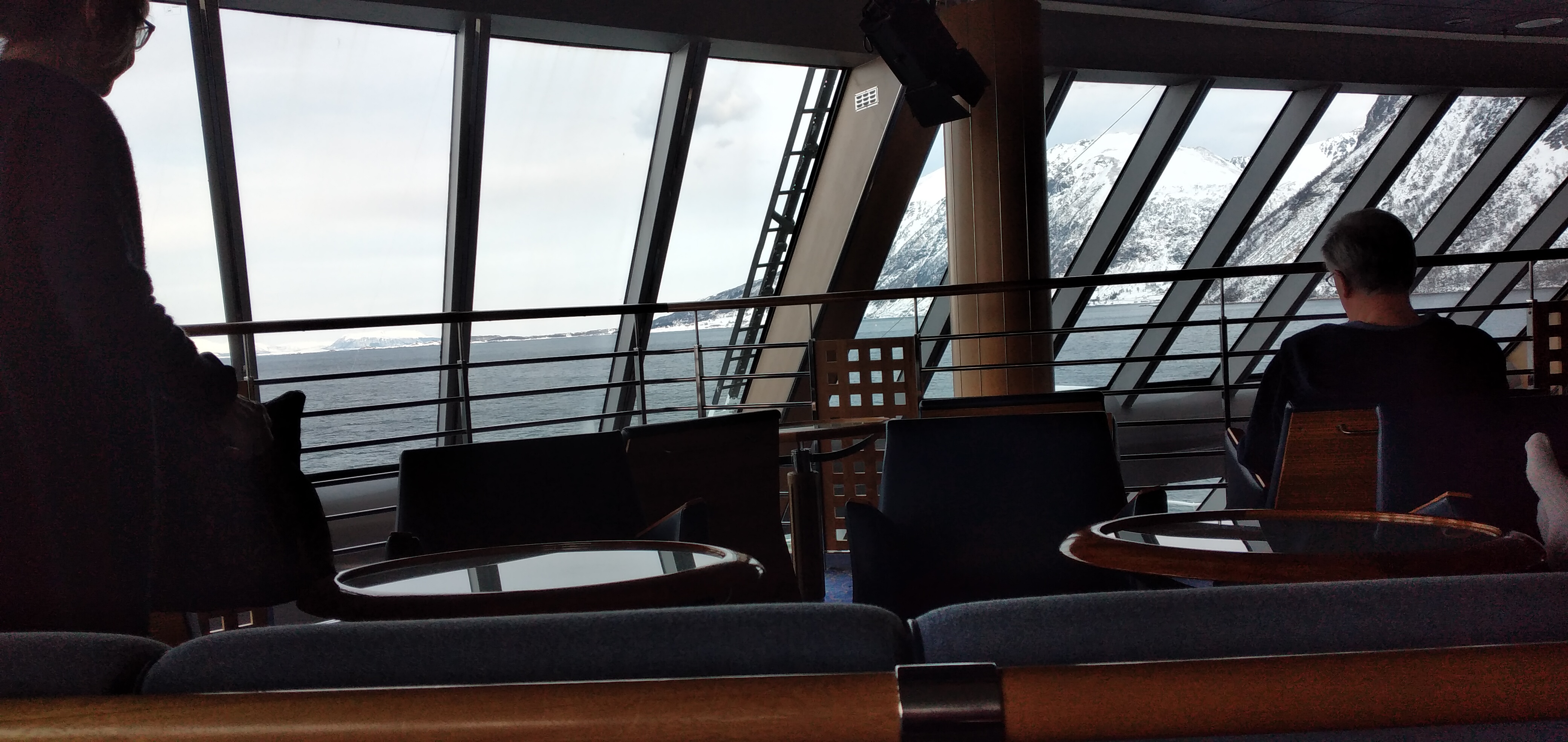 I tre giorni di crociera che abbiamo scelto di fare ( va beh , su questa nave ci lavora nostro figlio...) trascorrono lentamente tra panorami incantati di monti ancora innevati e stretti fiordi dove la bellissima motovave si spinge per essere prima di tutto un servizio per i più o meno piccoli paesi difficilmente raggiungibili per le strade tortuose e ghiacciate, ma il confort è ineccepibile.