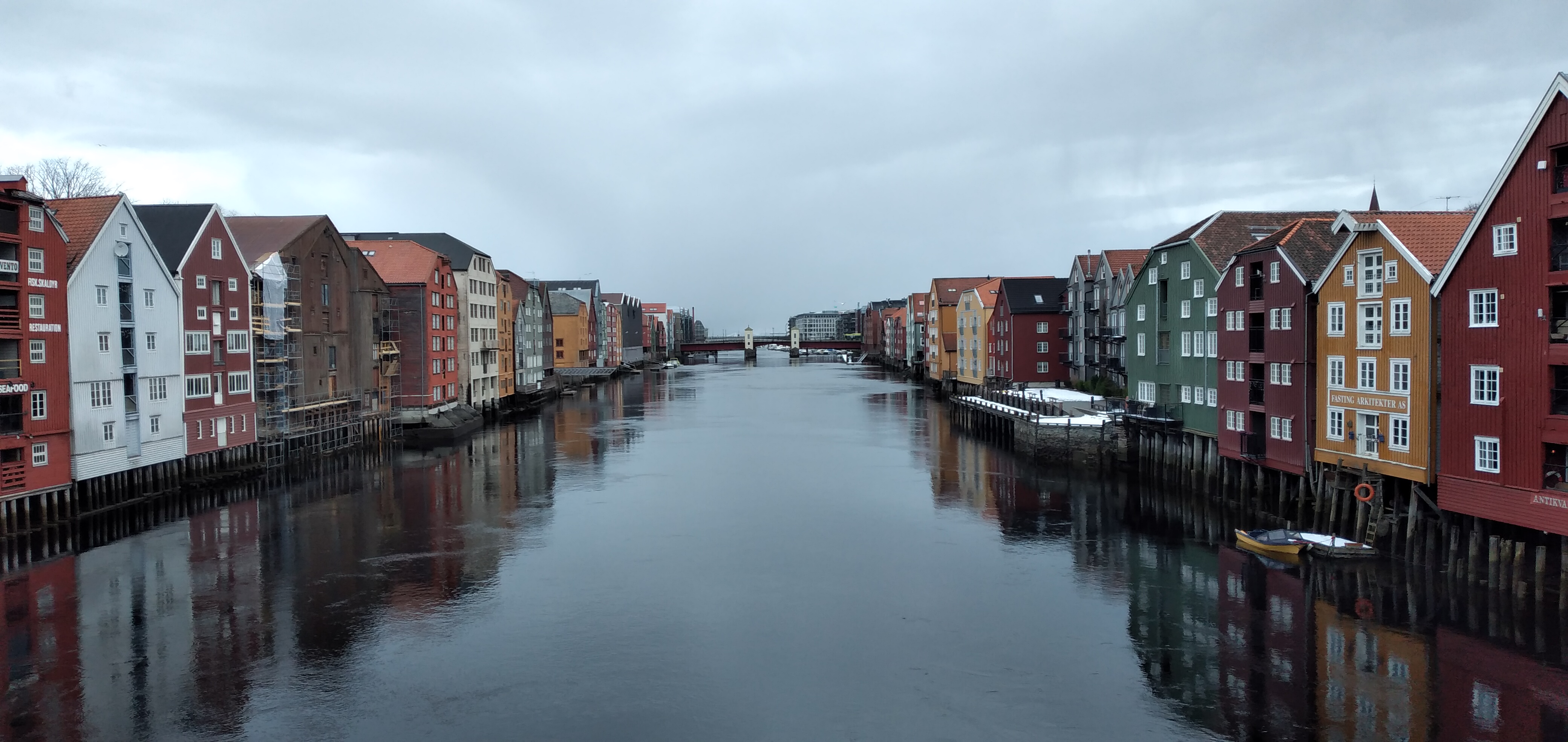 Percorrendo via Kambugata arriviamo all’antica cattedrale . La Cattedrale di Nidaros a Trondheim venne costruita nel 1070 e fu per tutto il medioevo meta di pellegrinaggio. Nel corso dei secoli come spesso accade ha subito numerose ristrutturazioni e la più importante c’è stata nel 1869 quando la cattedrale ha assunto uno stile gotico-romanico. Si nota anche da lontano, circondata dagli alberi. E’ un vero spettacolo osservarla anche da fuori. Dal 1814 è stata ripresa anche un’abitudine già nota nel medioevo, quella di incoronare i re di Norvegia in questa sede. Da lì attraversiamo Old Town Bridge e ci troviamo al di là del fiume nella zona degli antichi magazzini .