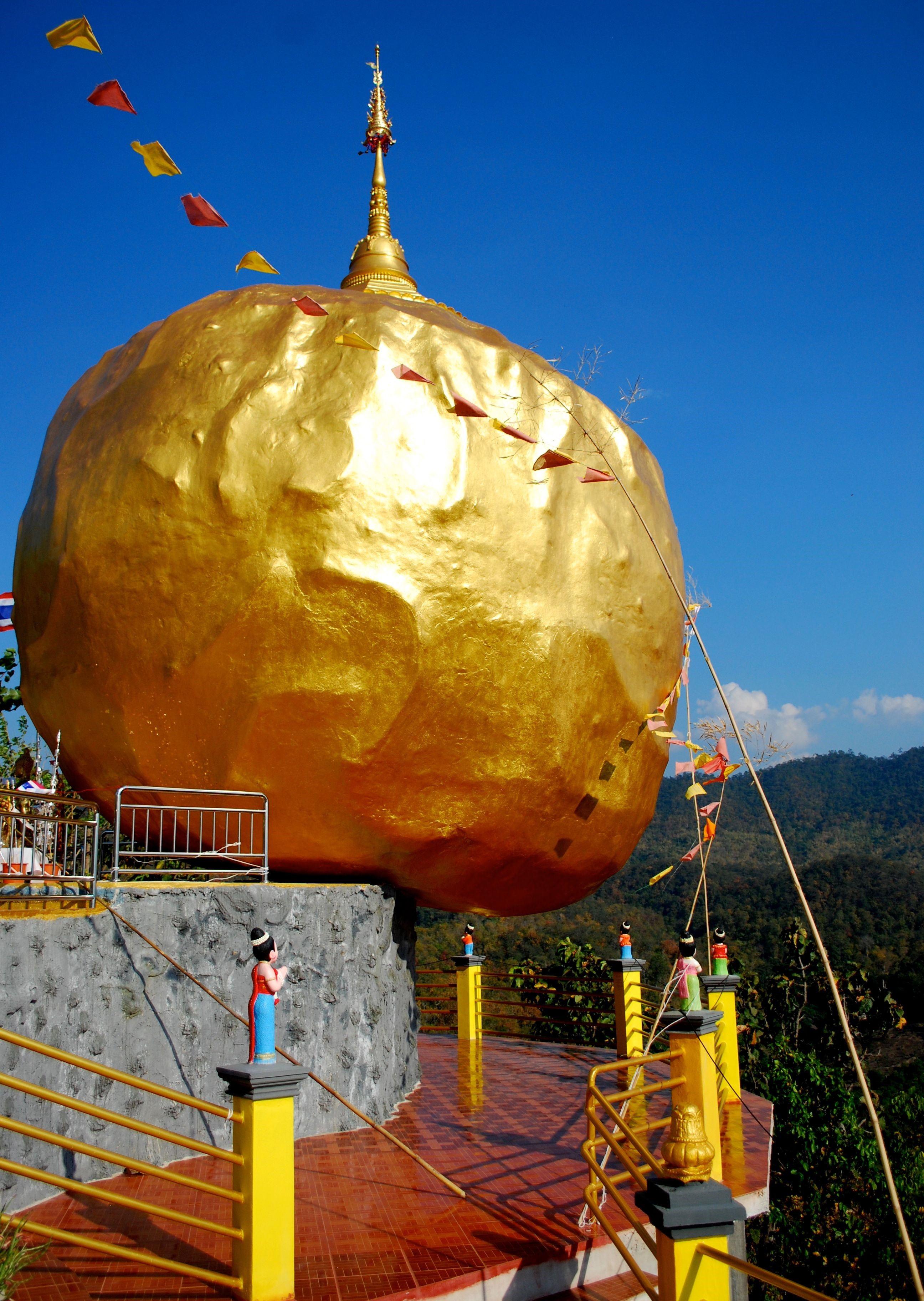 In cima a una collina, da dove si poteva ammirare un bel panorama, abbiamo avuto la sorpresa di scoprire una roccia d’oro in bilico e un piccolo monastero. Forse questo luogo non ha la fama della Roccia d’oro di Bago, in Birmania, luogo di pellegrinaggio e venerazione, perché era deserto e non vi erano nemmeno indicazioni per raggiungerlo.