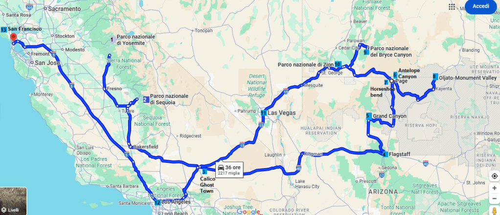 I biglietti aerei sono stati acquistati a metà febbraio 2025; il percorso è stato ideato nelle due settimane successive sfruttando anche i preparativi dello scorso anno che poi finirono nel nulla: alcune piccole correzioni sono state apportate nelle settimane successive – fino alla settimana prima della partenza, purtroppo con qualche esclusione molto sofferta (come Canyonlands National Park, Lower Antelope Canyon e il Big Sur).