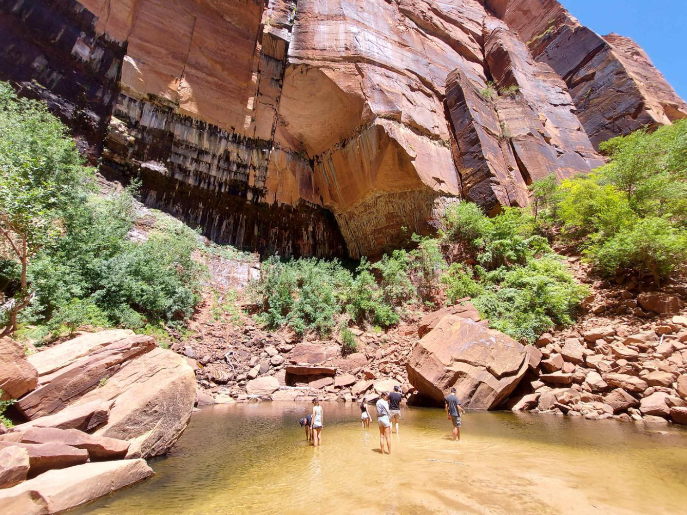 Essendo allo Zion lodge approfittiamo per seguire il percorso che parte proprio da qui e che va verso le Emerald Pools. Queste sono tre: lower, middle e upper. Il sentiero che porta alla Lower Pool è facile e piacevole perché si gode della nebbiolina dell’acqua che cade dalla cascata (di questi tempi la portata è bassa, ma l’effetto è gradevole). Il sentiero prosegue verso la Middle Emerald Pool, poco più che uno spruzzo d’acqua che alimenta la cascatella che vedevamo da sotto. Non ricordo se si piò procedere direttamente verso la Upper Pool: nel qual caso, vista la fatica che vi attende, si potrebbe omettere questa tappa intermedia. Altri 45 minuti per avventurarsi tra sentieri stretti, in salita e non ben pavimentati (per noi camminatori di scarsa esperienza potrei direi che sono di difficoltà media): il caldo aumenta la sensazione di fatica, ma fortunatamente l’arrivo ci regala un po’ di fresco sia per la fitta vegetazione sia per il bel laghetto sotto la grotta. Vanno ricordate due cose: nel laghetto non ci si può bagnare (anche se lo fanno in molti) e non bisogna dare da mangiare alla fauna selvatica. In particolare gli scoiattoli qui sono già intraprendenti per conto loro: sarete sorpresi a vederli camminare tranquillamente tra le persone e tentare di aprire gli zainetti dove sentono odore di cibo. Anche per noi è il momento della pausa pranzo.