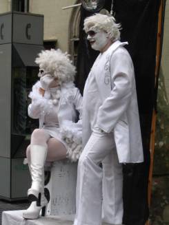simmetricamente delle maschere bianche,calchi di persone, ti guardano con gli